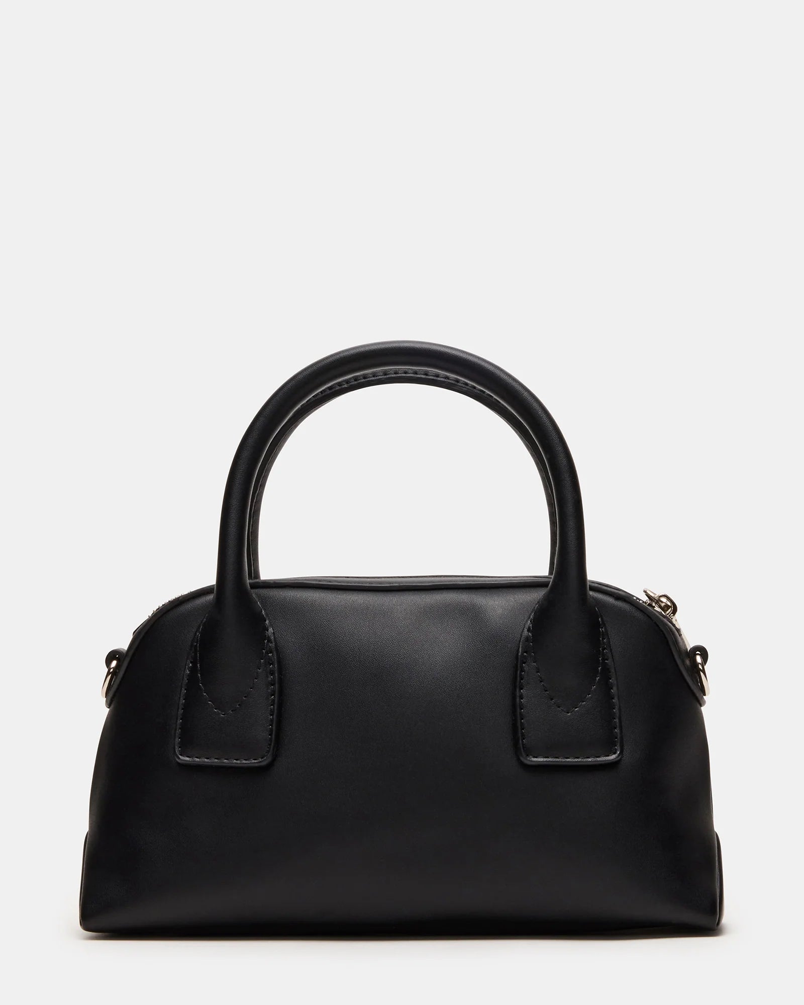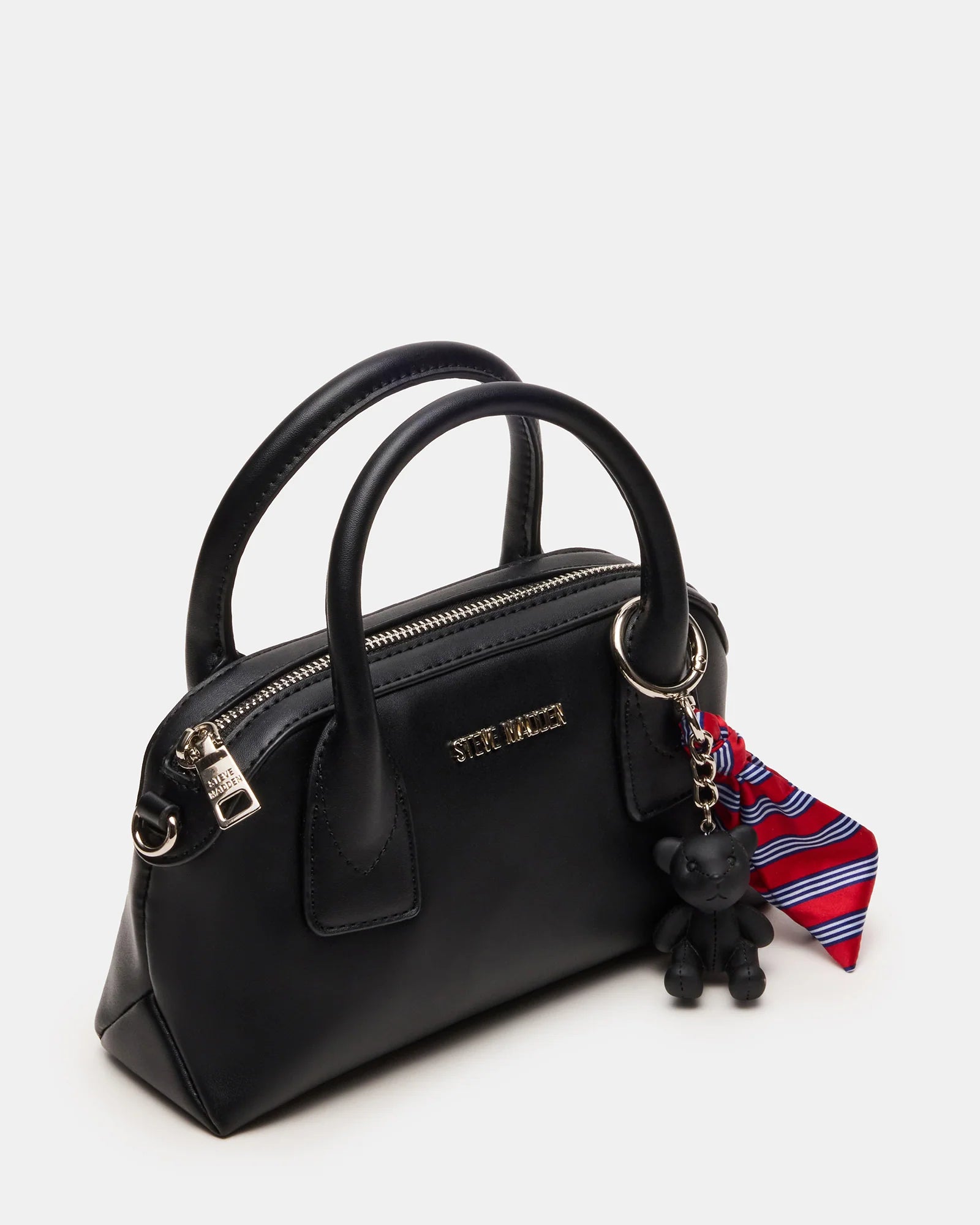 The MELODIE BAG BLACK features a versatile top handle paired with an attachable crossbody strap for adaptable wear. Enhanced with a charming attachable bear bag charm and a colorful scarf, it adds a sophisticated touch to your ensemble. Secure your essentials with the zipper closure, while the interior pouch on the back wall offers organized storage for smaller items. This bag blends stylish accents with practical design, perfect for refined, everyday use.