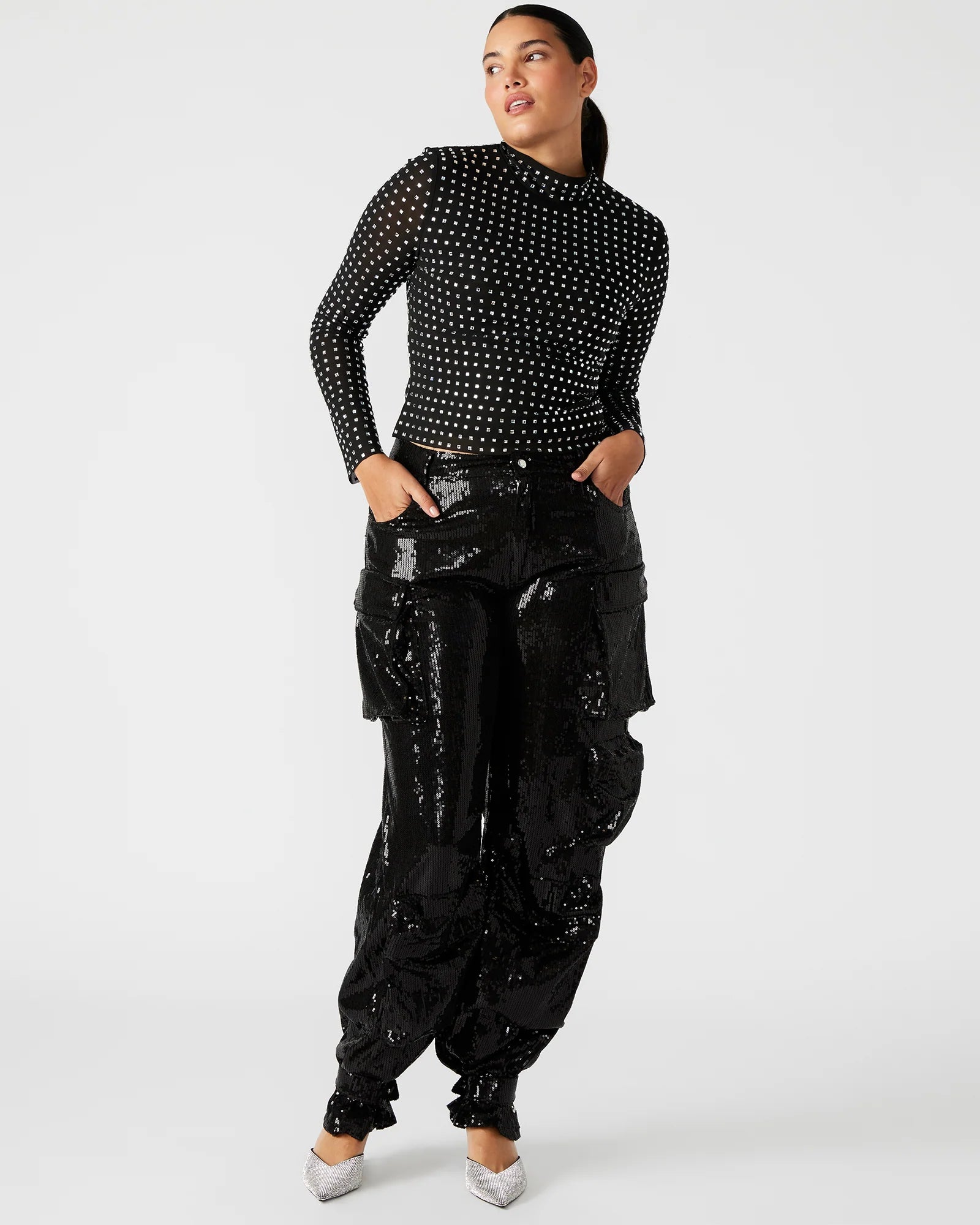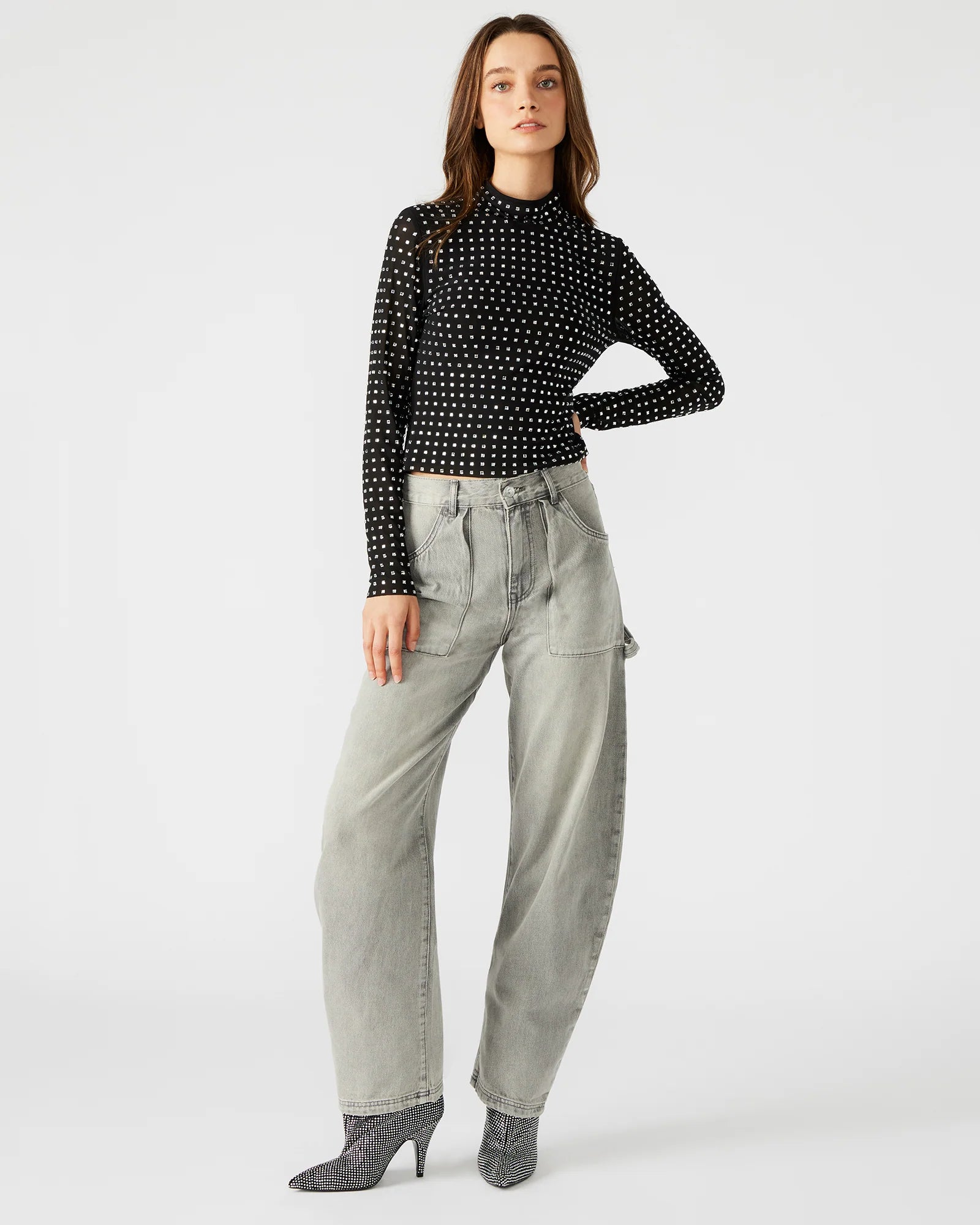 The MELVINA is a sophisticated and versatile choice for any wardrobe. With a sleek mock neck and long sleeves, this top offers both coverage and style. The delicate mesh sheer fabric adds a touch of elegance, while the square-shaped embellishments provide a subtle yet glamorous touch. Perfect for any occasion, this top is a must-have for any fashion-forward individual.