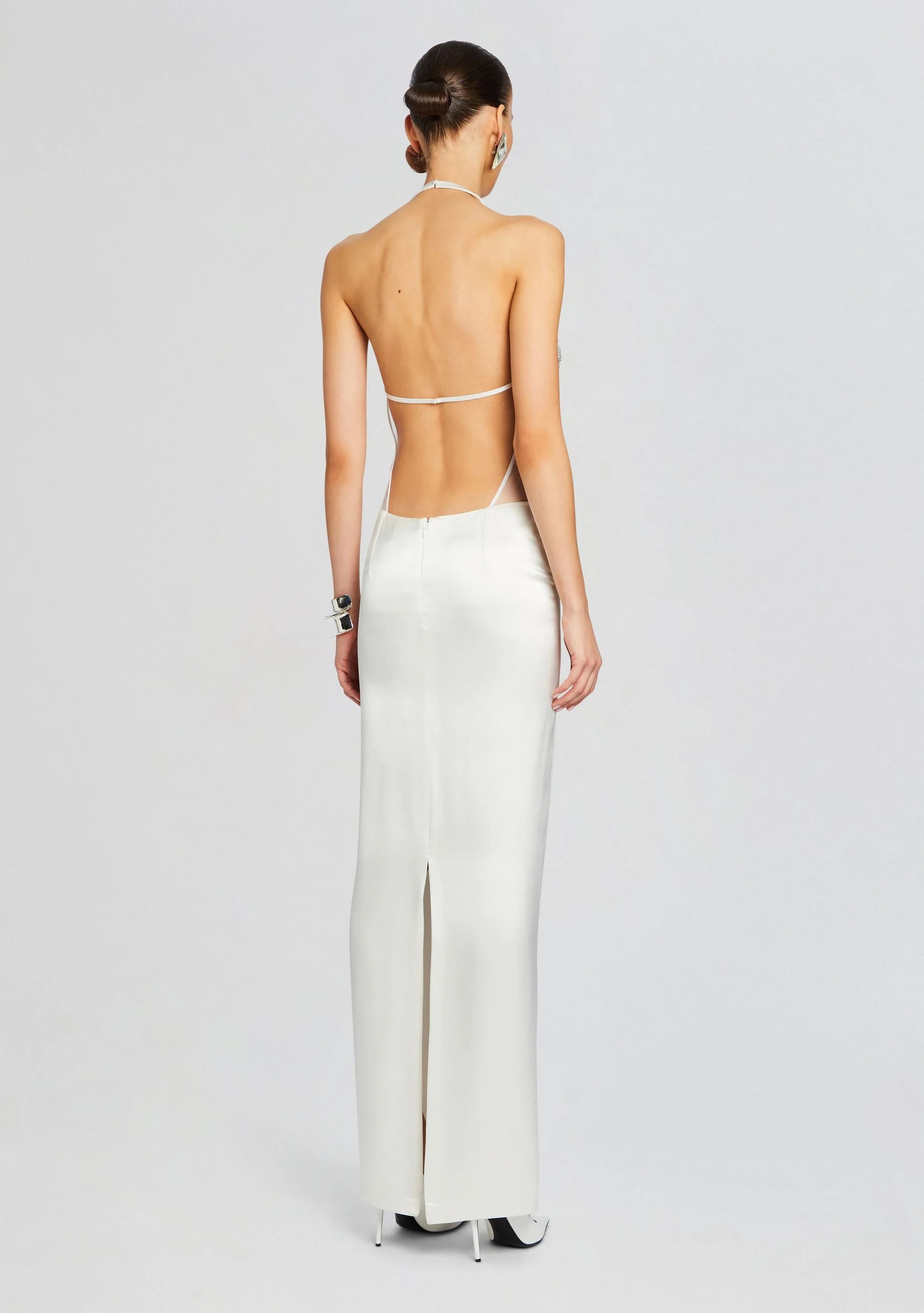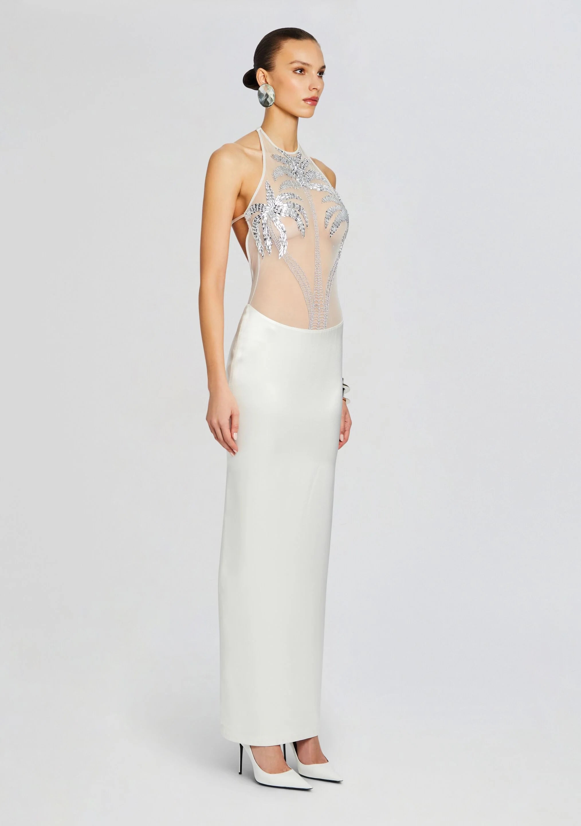 Step into elegance and sophistication with our Meridian Dress, featuring a sheer top adorned with palm tree embellishments for a touch of tropical glamour. With its sleek silhouette and open back design, this gown exudes modern sophistication. Shown here in White.