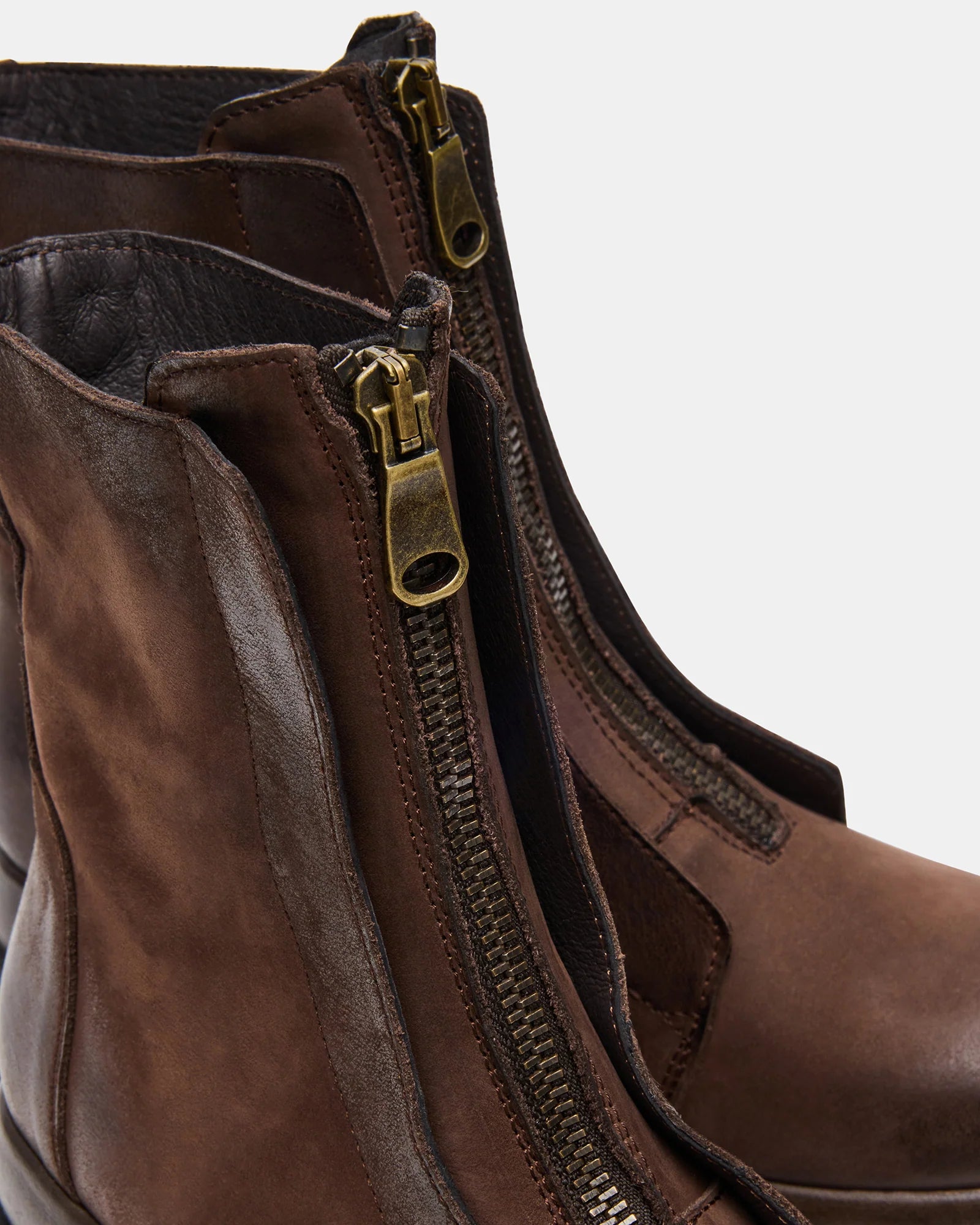 The MILTON BROWN LEATHER ankle boot delivers a sleek moto-inspired design with durable leather construction. This combines rugged aesthetics with refined craftsmanship, offering both style and lasting comfort. Its sturdy sole ensures reliable traction, making it an ideal choice for those seeking an edgy yet practical footwear option.