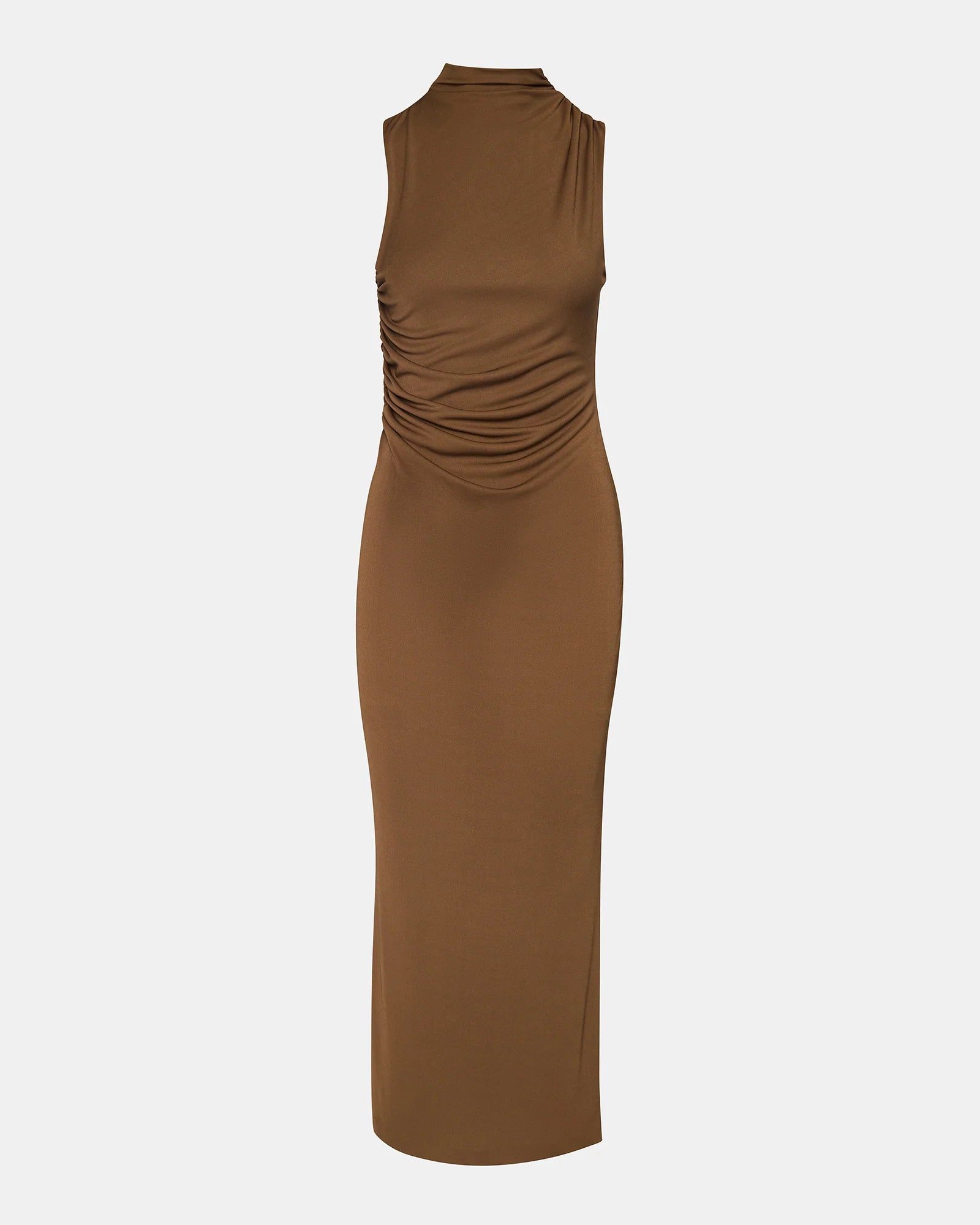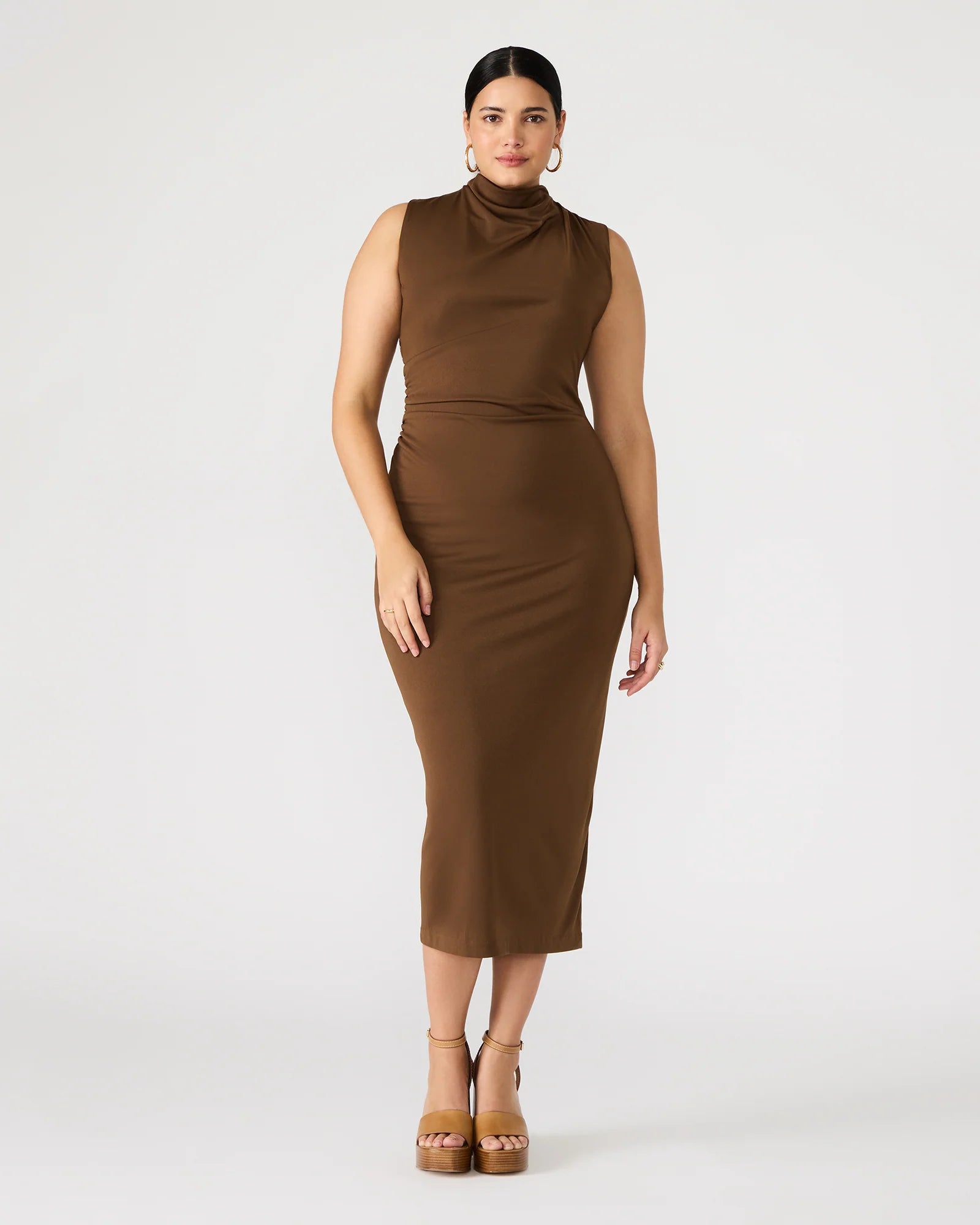 This MO features a mock neck and midi length, with a convenient back zipper closure. Its sleek fitted design makes it perfect for any formal occasion, while the zipper ensures a secure fit. Elevate your wardrobe with this elegant and stylish dress.