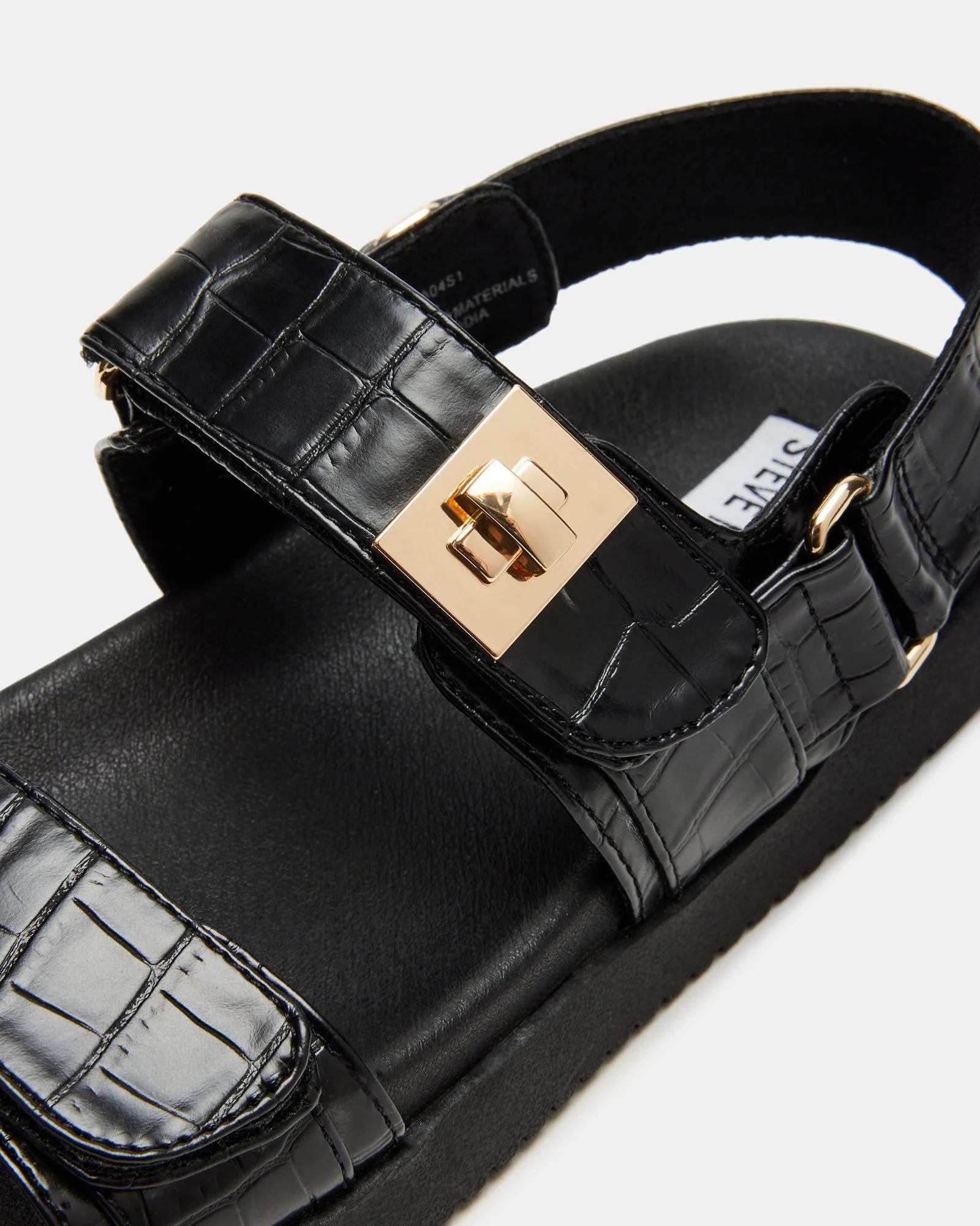 The MONA takes the classic three-strap design with a molded footbed and a flat sole and elevates it with a vegan leather construction and substantial gold tone hardware.