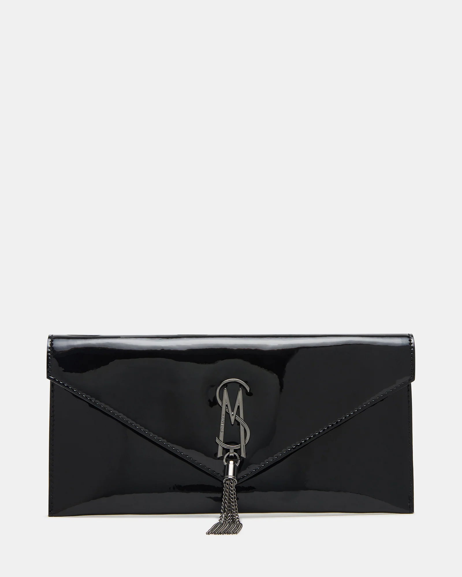 Expertly crafted in sleek black patent, the MORGANA bag offers both style and functionality. With its envelope design and magnetic snap closure, this clutch handbag is perfect for a night out. The interior includes a zipper wall and has enough room to fit a large phone. Finished with a chain tassel featuring the logo, it's a must-have accessory.