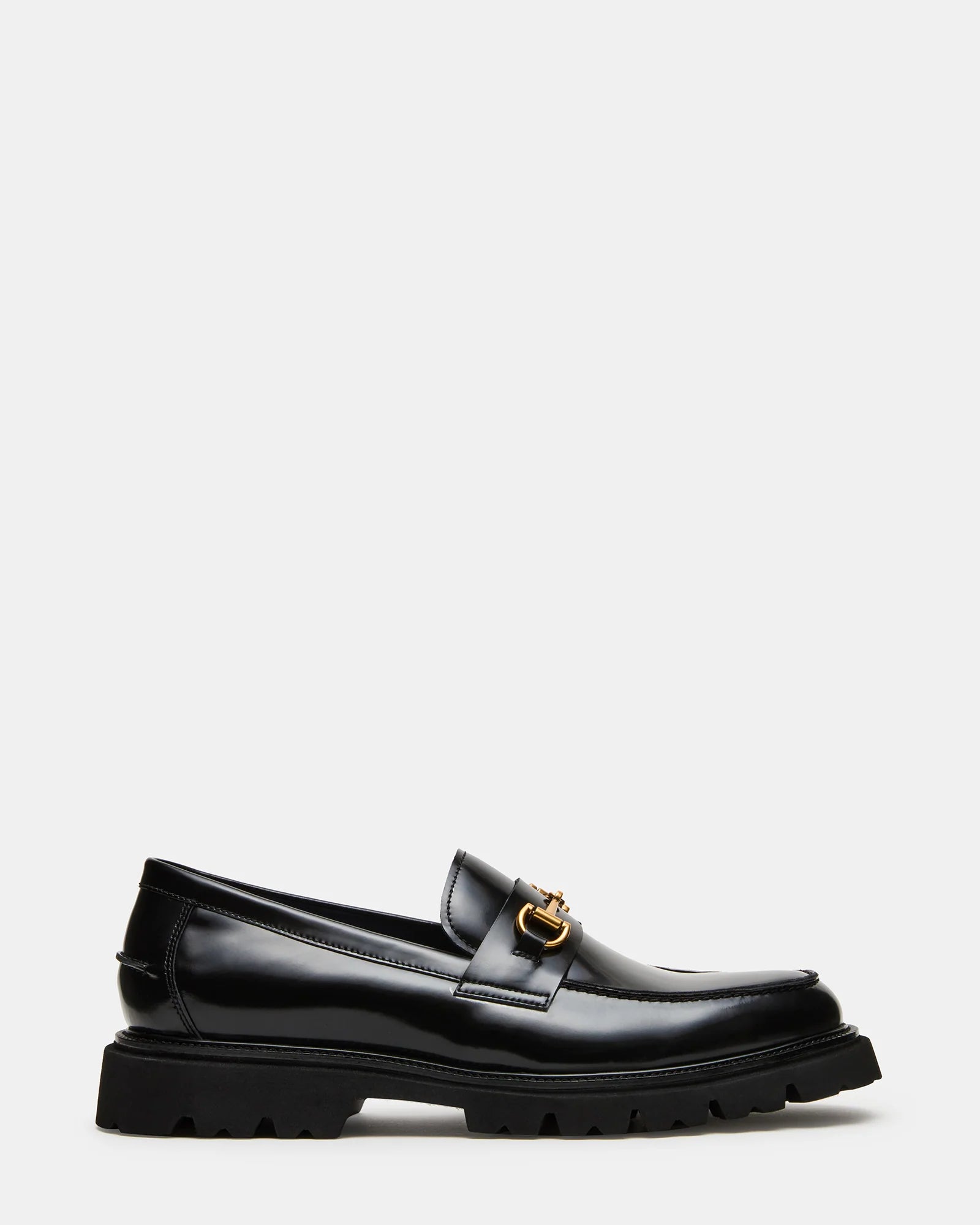The NAXOS BLACK LEATHER slip-on combines timeless style with durable design, featuring a signature horsebit hardware decal for a refined touch. Its lug sole offers enhanced traction and stability, making it a versatile choice for both professional and casual settings. Crafted from premium materials, this loafer ensures lasting comfort and sophistication.