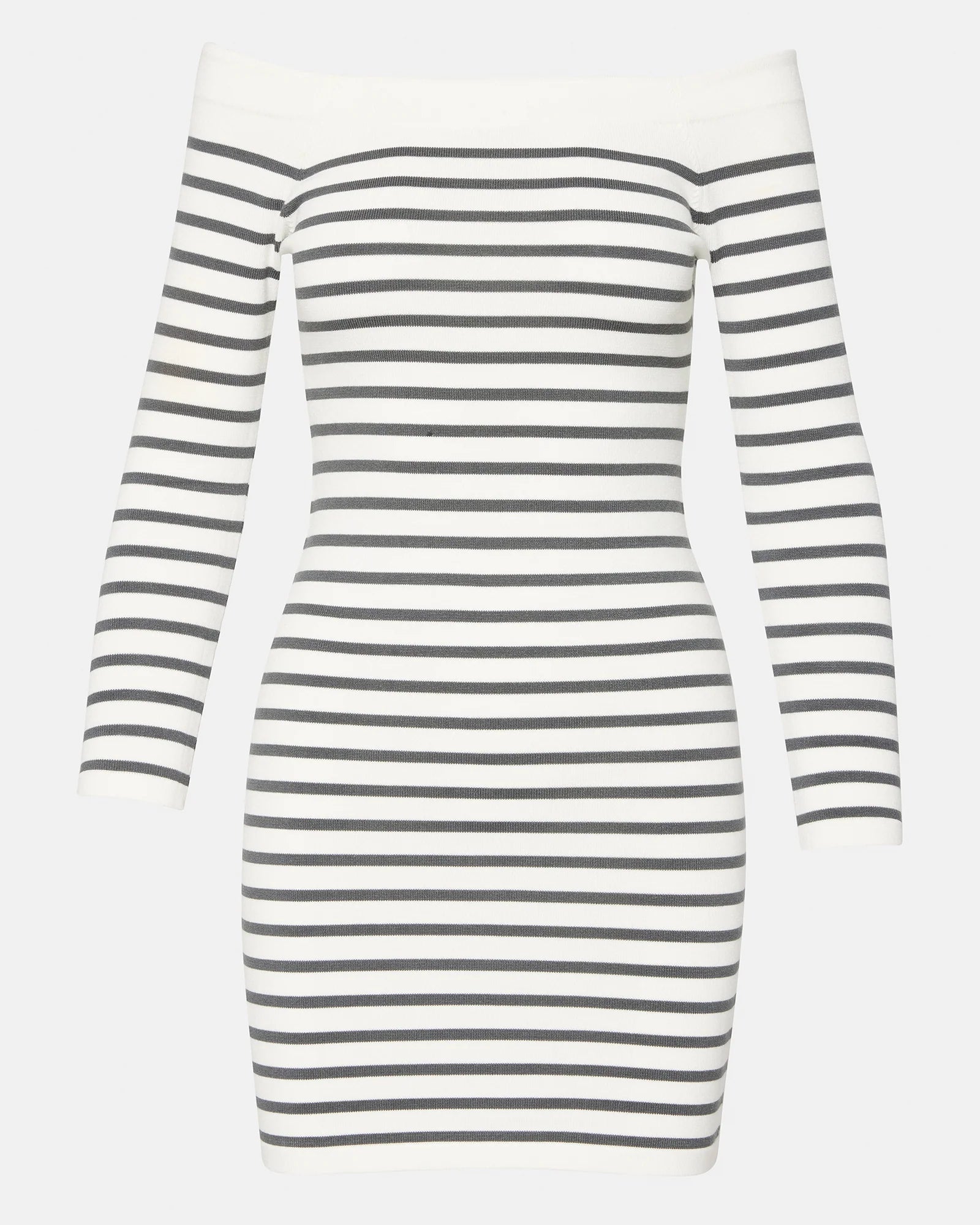 The NOA sweater is a mini off-the-shoulder dress with a bodycon fit and 3/4 length sleeves. Designed with a chic black and white striped pattern, this dress is perfect for a night out or a casual day look. Its bodycon fit accentuates your curves while the off-the-shoulder style adds a touch of sophistication. Stay stylish and comfortable with this versatile dress.